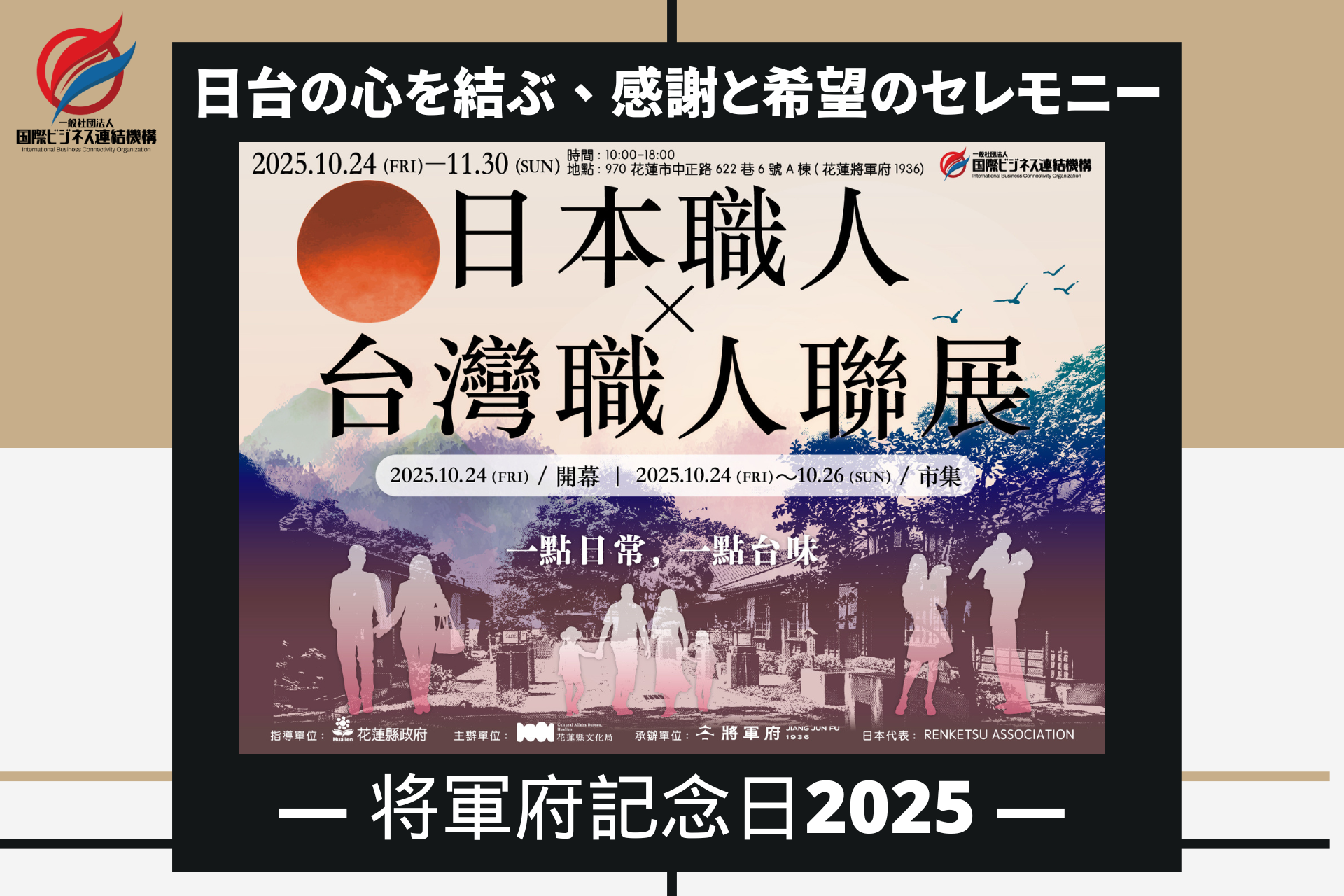 日本企業の海外進出を「知識・人脈・きっかけ」の3つの軸で支援する、一般社団法人国際ビジネス連結機構(所在地:東京都港区、代表理事:松浦啓介)は、台湾文化部(日本の文部科学省に相当)との共催により、2025年10月24日(金)、台湾・花蓮市の歴史的建築「将軍府(General Mansion)」にて**第2回「将軍府記念日セレモニー」**を開催しました。