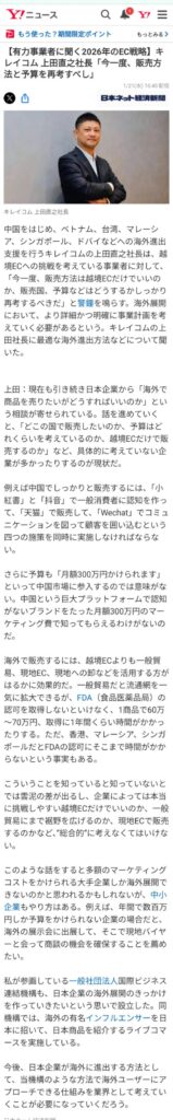 【有識者に聞く2026年のEC市場展望】として、当機構理事・上田のインタビュー記事がYahoo!ニュースに掲載されました。記事では、越境ECに限らない販売手法の選択や、進出国・予算設計を含めた事業計画の重要性について言及。中国市場をはじめとした具体例を交えながら、実践を前提とした海外展開の考え方が紹介されています。